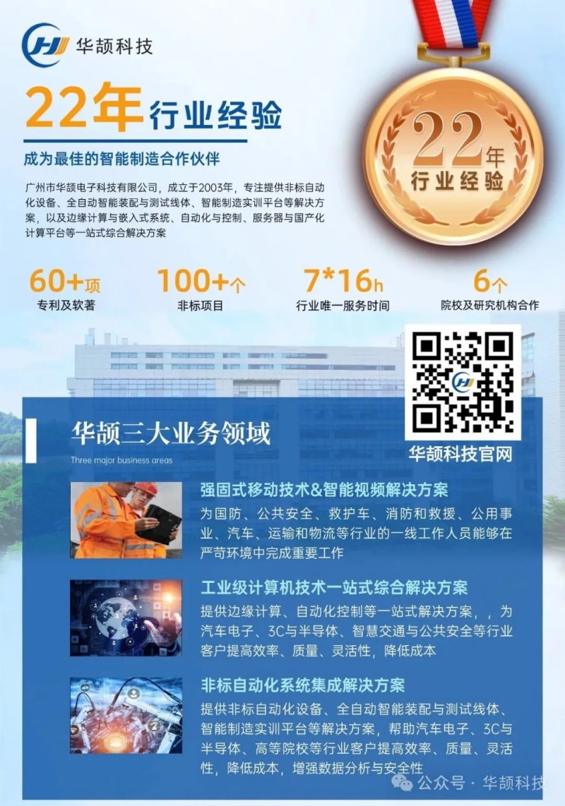 華頡科技憑借22年深耕行業(yè)的豐富經(jīng)驗,獲得國家級高新技術(shù)企業(yè)、廣東省專精特新企業(yè)、廣州市瞪羚企業(yè)、廣東省科技專家工作站等認(rèn)定榮譽。專注提供非標(biāo)自動化設(shè)備、全自動智能裝配與測試線體、智能制造實訓(xùn)平臺等解決方案,以及邊緣計算與嵌入式系統(tǒng)、自動化與控制、服務(wù)器與國產(chǎn)化計算平臺等一站式綜合解決方案,能快速、全面地滿足客戶多樣化需求。幫助汽車電子、3C與半導(dǎo)體、高等院校等行業(yè)客戶提高效率、質(zhì)量、靈活性,降低成本,提升客戶的競爭力。