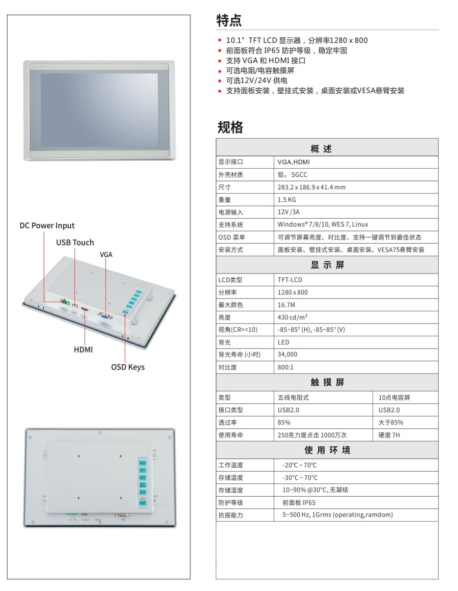 設備提供VGA和HDMI雙接口,兼容多種工業設備與主機的信號輸入,方便系統集成 。用戶可根據實際應用需求,在電阻式與電容式觸摸屏之間靈活選擇:電阻屏支持手套、觸筆等介質操作,環境適應性廣;電容屏則支持多點觸控,提供更流暢靈敏的觸控體驗 。供電方式支持12V或24V直流輸入,適應不同的現場電源配置 。