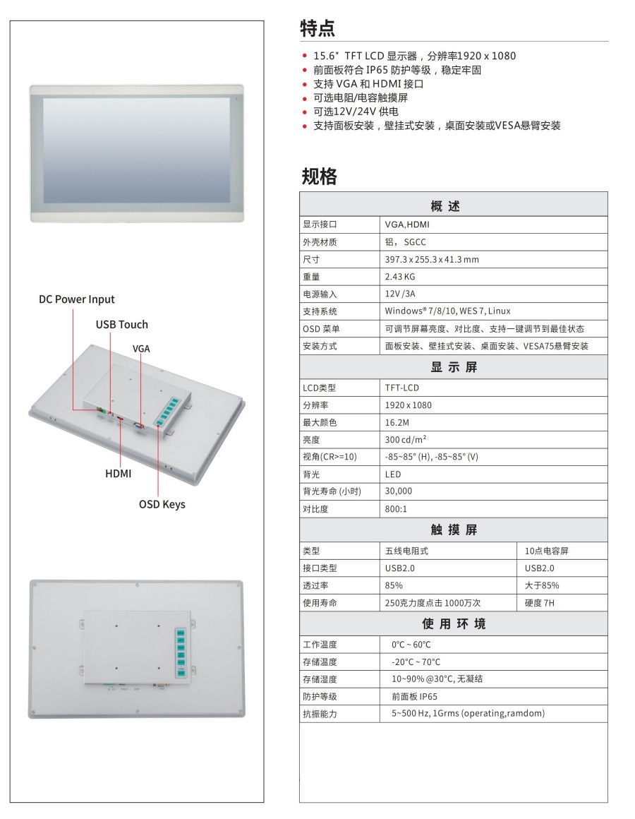 ?15.6" TFT LCD 顯示器,分辨率1920 x 1080