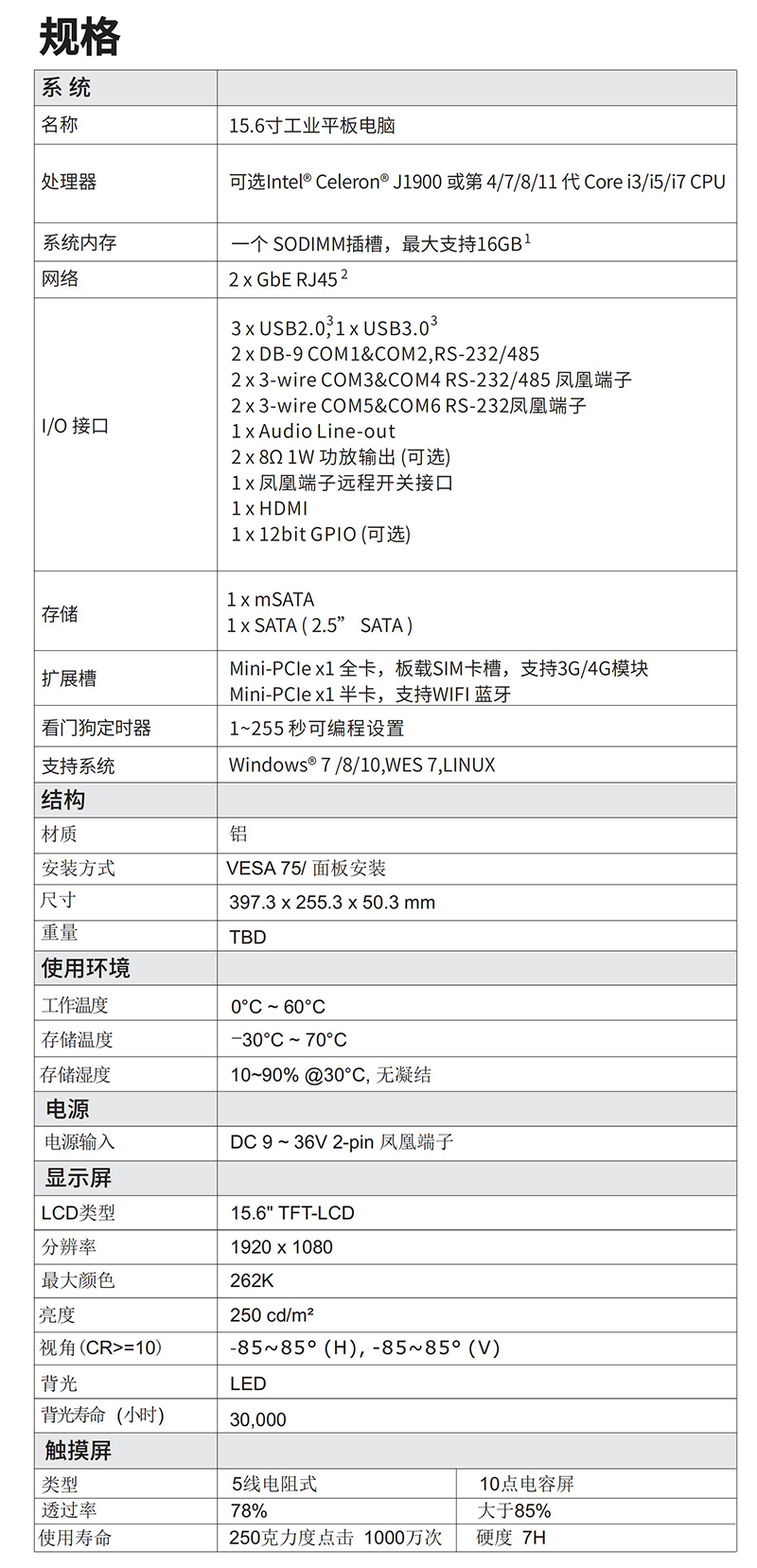 ?尺寸多樣,包括10.1寸~21.5寸等多種規格可選 ?可選Intel? J1900 或第4/7/8/11 代Core i3/i5/i7 CPU ?一個 SODIMM內存插槽,最大支持16GB內存 ?LCD+HDMI 雙顯,同步/異步模式 ?全平面觸摸屏,前面板IP65防護等級 ?低功耗無風扇 ?9 ~ 36V 寬壓輸入
